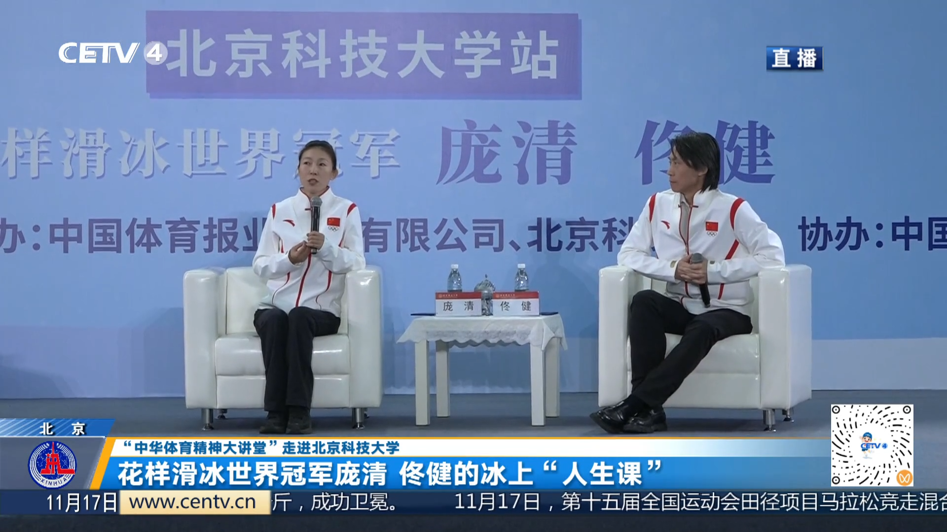 11月16日,“中华体育精神大讲堂”校园宣讲活动、“冠军体育课”运动员进校园活动走进北京科技大学。花样滑冰世界冠军庞清、佟健为北科学子带来了一堂兼具力量与温度的冰上“人生课”。原文链接:中国教育电视台...